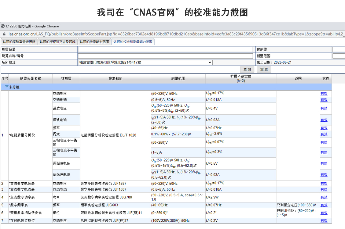 我公司具有電能質量分析儀(在線式和便攜式)、電壓表、電流表、相位表、頻率表等相關監(jiān)測、計量和保護類表計類校準CNAS資質,可根據(jù)具體情況為客戶提供實驗室或現(xiàn)場靈活方式校準業(yè)務。